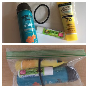 Another handy idea is using clear gallon bags for sorting items in your toiletry bag for quick use and to put any wet items in if you have to go quickly. Here is my suncare products that all fit in a snack size ziplock bag.