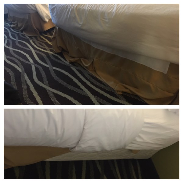 Our friends met us at the hotel and we went up the to drop off our bags off in the room. I was distracted so did not notice first off that the bed skirts weren’t really on either of the beds in the room. My friend was looking at the beds funny so I turned around and saw both bed skirts literally hanging off the beds. This seemed very odd and didn’t make me feel warm and fuzzy about the attention to detail that had been put into the housekeeping for our room. The floor did not seem to have been vacuumed either. I chalked this up to having asked for early check in, yet it still bothered me. After all I didn’t just surprise them showing up an hour ahead of check in and asking for my room, I had pre-arranged it in my stay preferences and followed up with a call to the hotel.