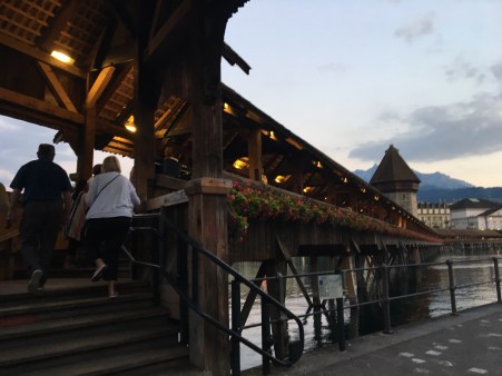 Later we crossed the Chapel Bridge again on our walk to dinner. It was a totally different feeling with the sun setting and the lights along the bridge all coming on. It was even prettier as it got fully dark.