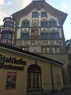 The Stadkeller was where we went for Dinner and a Swiss Folklore show. The buildings in Lucerne are so ornate. The restaurants exterior had traditional colors and artwork while the building across the street from it had really bold colors and darker themed images. I would have like to have seen inside that building too!