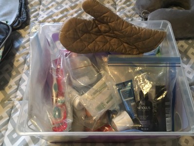 The oven mitt is for my hair straightening iron which gets very hot In the event that we don’t have time to let it fully cool before we have to pack up, I just slide it into the oven mitt and wrap the cord around the outside before dropping it into my bag.