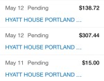 When we returned for the day, we parked in a nearby self service garage for less than 1/2 the cost of the Hyatt Valet Parking.  The next morning American Express sent me another alert for an even larger charge to my account from Hyatt.  When I logged into my credit card account, there were actually 3 charges now.
