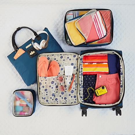 The packing cubes depicted above all fit into one carry on bag. The first cube on the left has a divider and pockets inside. I use it to pack all my undergarments and socks. The largest cube has rolled leggings, sweaters and bulkier tops. The middle cube contains rolled tank tops, tees and scarves. The smallest cube has 1 or 2 swimsuits, a cover up and rubber flip flops for making my way to the beach or pool.