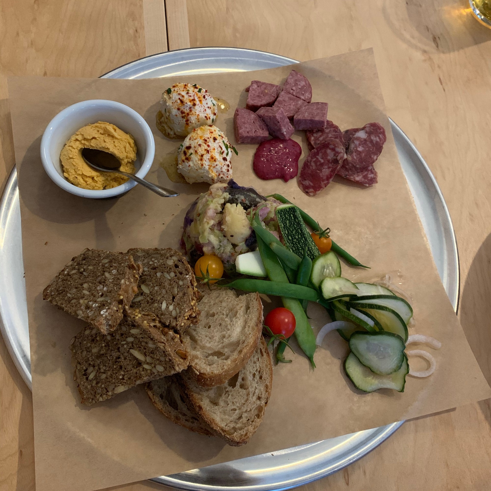 We ordered the Ploughman’s Platter which was was made from the finest quality local ingredients and big enough to share. I loved the hearty multi grain bread paired with the fresh veggies and goat cheese. Yum!
