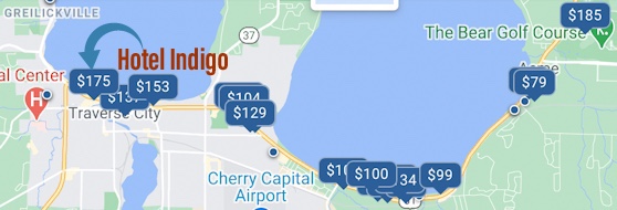 - The hotel location compared to others (8.6 miles between). Hotel Indigo is one of the closest hotels to Downtown TC and just a quick trip to Suttons Bay.