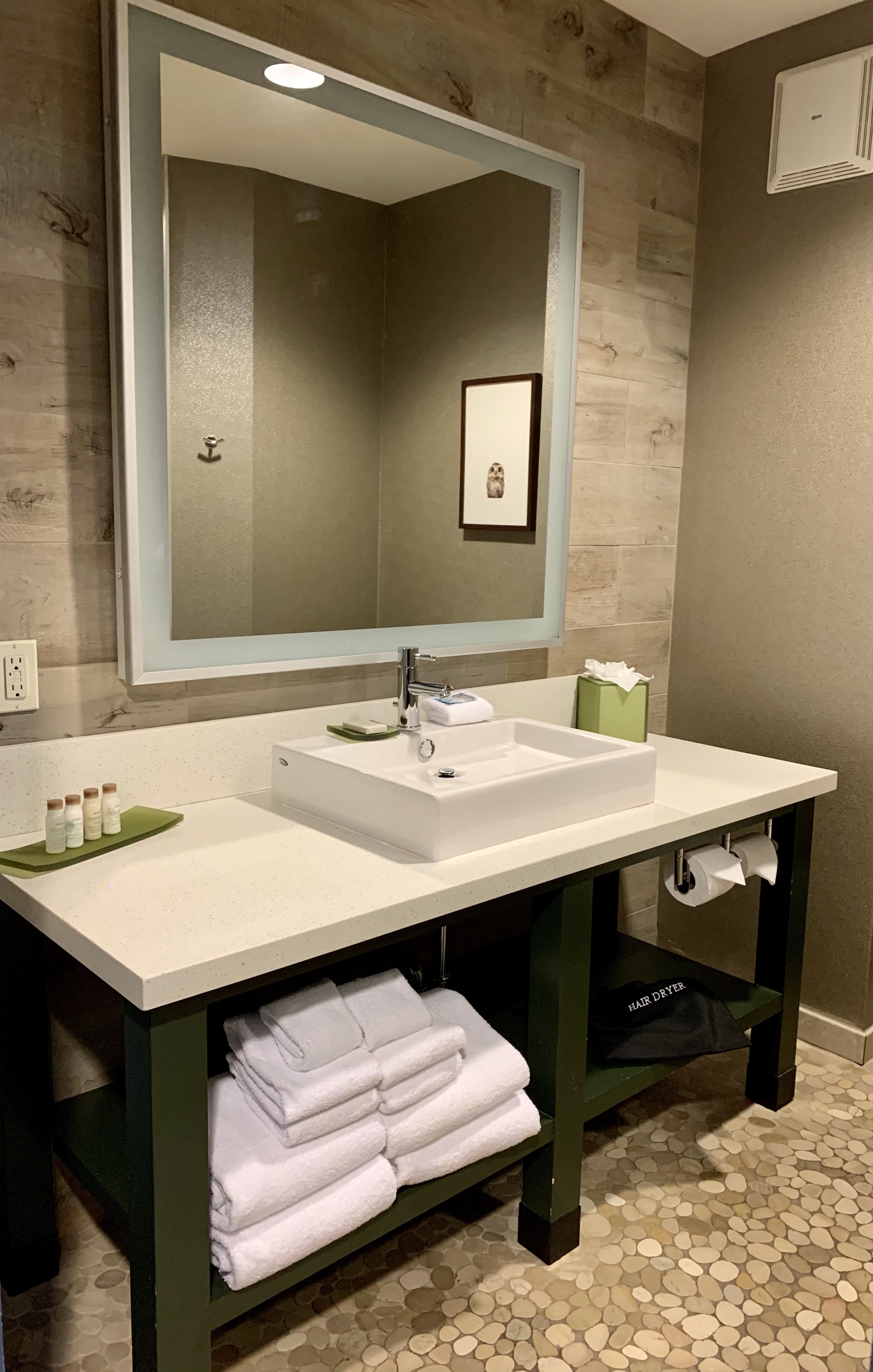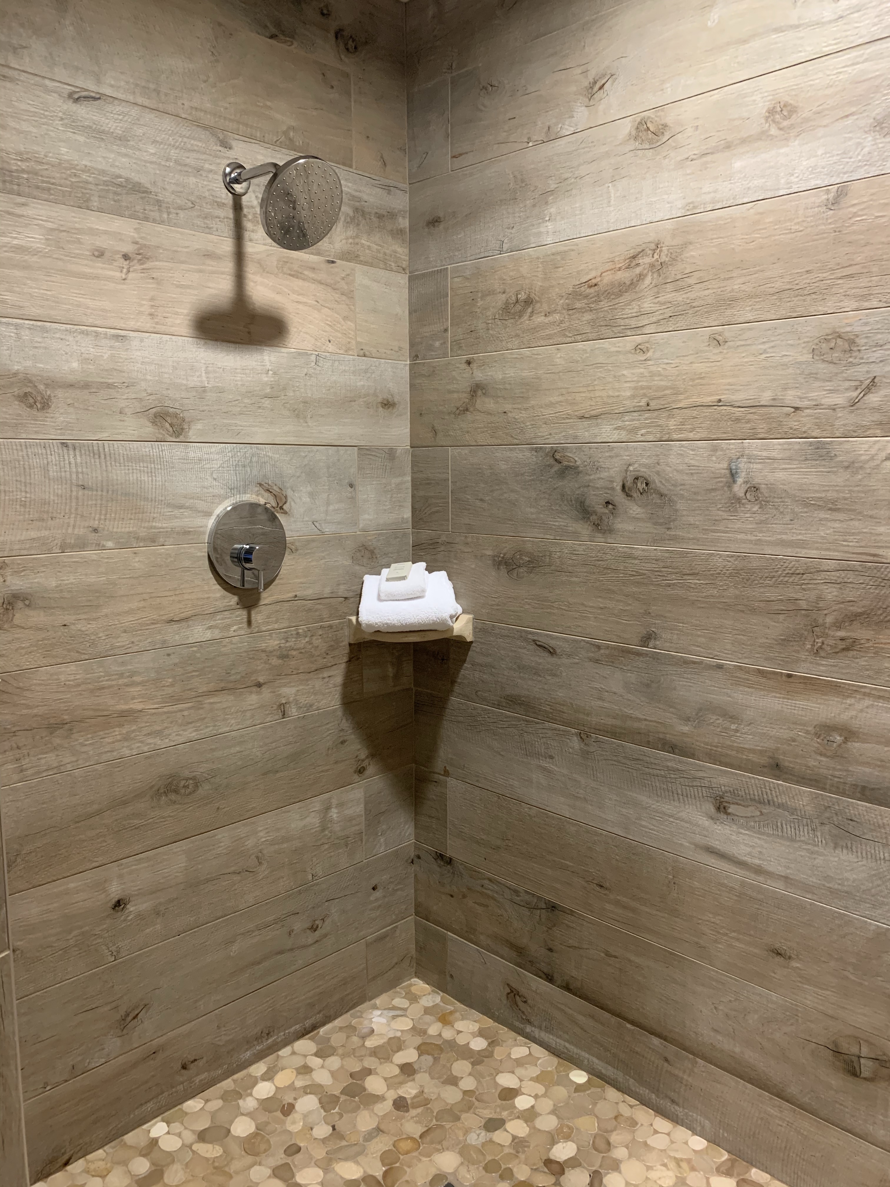 The rustic theme flowed into the bathroom which had a sliding barn door, pebbled stone flooring and tile walls that resembled wood planking in the shower. The vanity had plenty of counter space for 2 people, an ample supply of towels, and enough extra space to store our sundry bag out of the way. The hotel also provides their guest rooms with Aveda Rosemary Mint bathroom amenities.