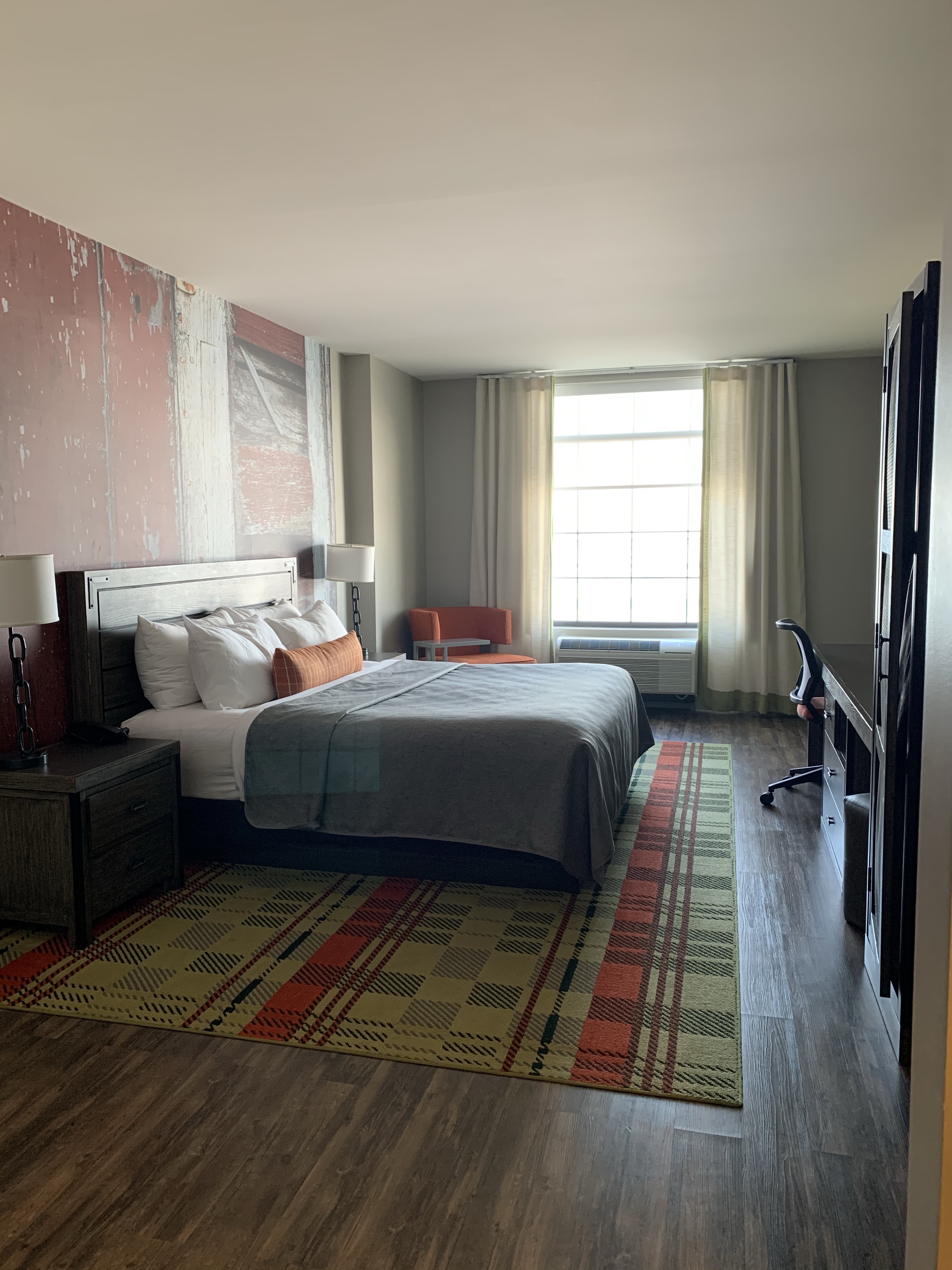 When making the reservation, I paid a few dollars more to book a room with a bay view. Our room was on the 4th floor and the view was indeed lovely. Our room also featured the Up North rustic themed decor. The wallpaper behind the bed gave the appearance of an old barn wall and the furniture was covered in a veneer designed to look like weathered boards.