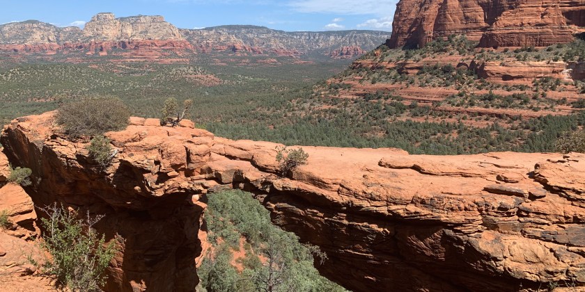 Devil’s Bridge is the largest natural sandstone arch in the Sedona area. The hike is listed as MODERATE, which was important, since I am not a frequent hiker and I have asthma. There are two main Trailheads to get to Devil’s Bridge. The Mescal Trail lists the hike as a 4 mile round trip, while the Chuckwagon Trail says it is 5.8 miles. The two trails eventually converge into one path to the bridge. Although we chose the Mescal Trail, somehow we managed to log 7.5 miles.