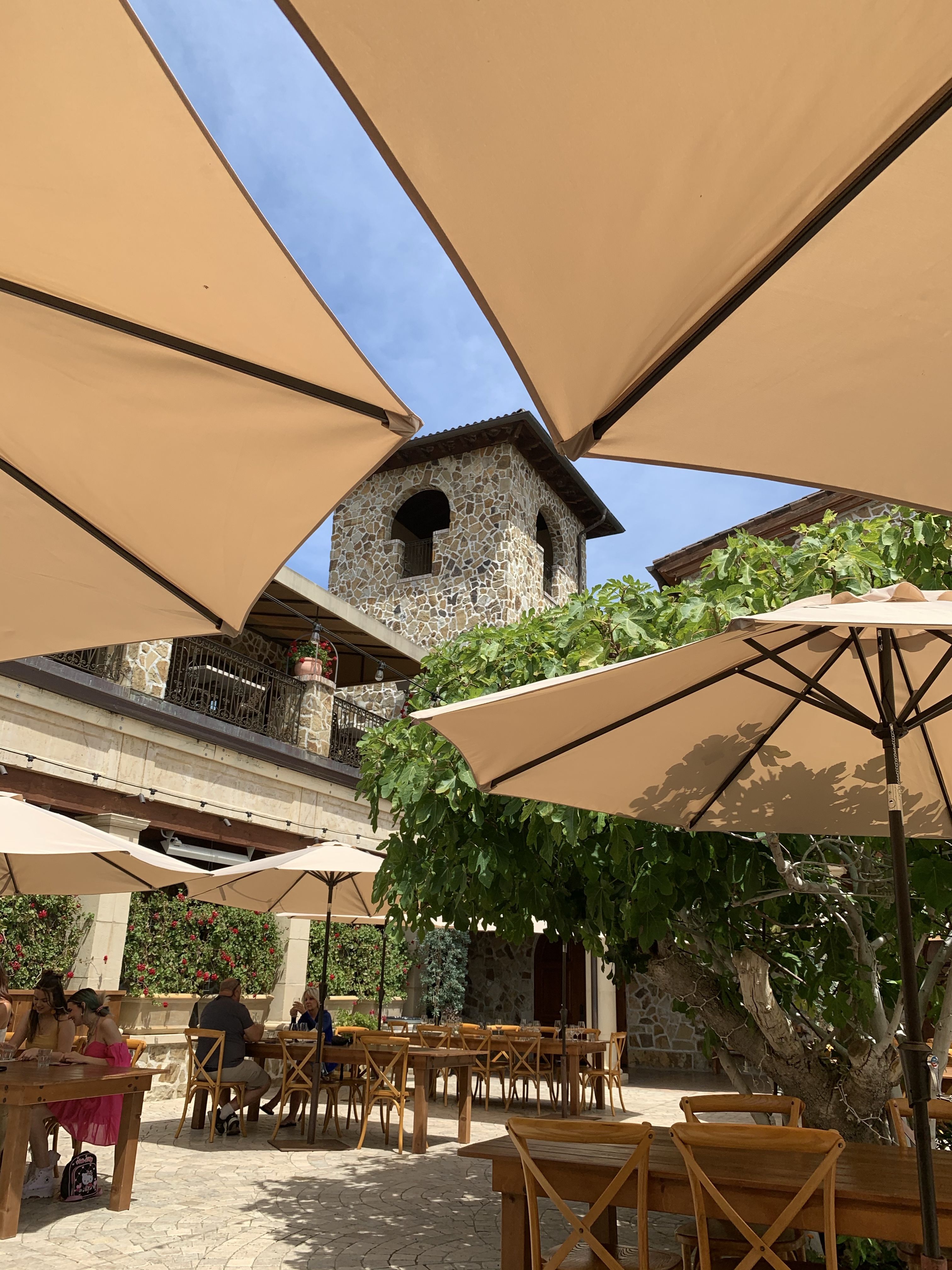 With two very sophisticated tastings scheduled on our last day, we split them up with a stop at nearby V. Sattui Winery for lunch and Wine Tasting. They have a lovely picnic area set up for people to enjoy their meal. When we went into their Italian deli, I was pleased to see a really large variety of menu options. Mark went all in ordering the Italian seafood salad, olives and feta in seasoned oil, and lasagna. I tried to keep it light with the chicken almond salad but couldn’t resist adding an arancini and a canoli. Oh well, vacation calories don’t count and it was worth it because everything was delicious.