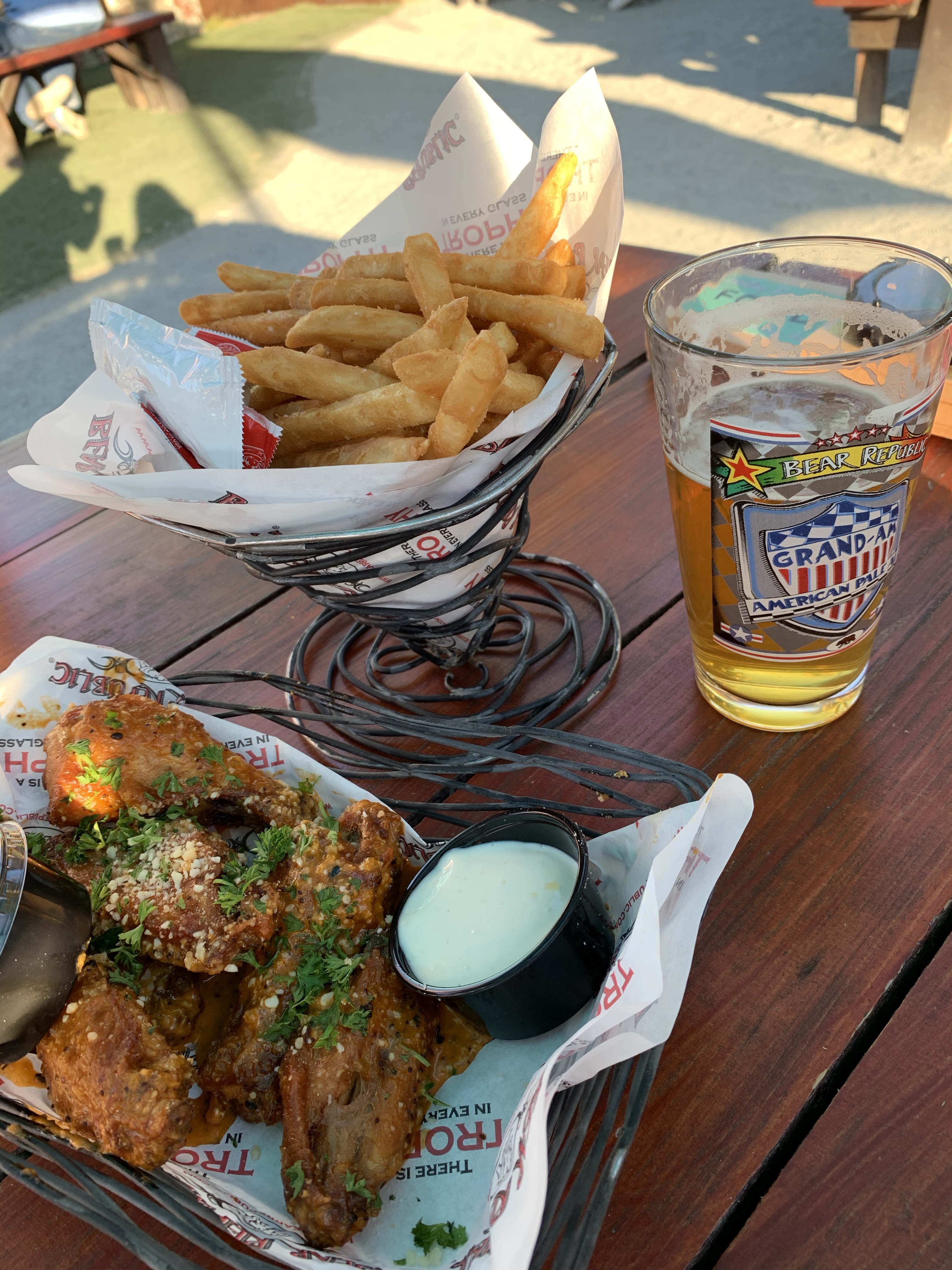Neither of us was starving, so we decided to split an order of wings and a side of fries. We got the wings with the “house sauce” which was crazy good. When we finished the wings there was still sauce in the basket so I dipped my fries into it. Spicy yummy goodness! I was glad I had ordered a Bear Republic IPA which tasted really good and helped cut the heat from the wings.