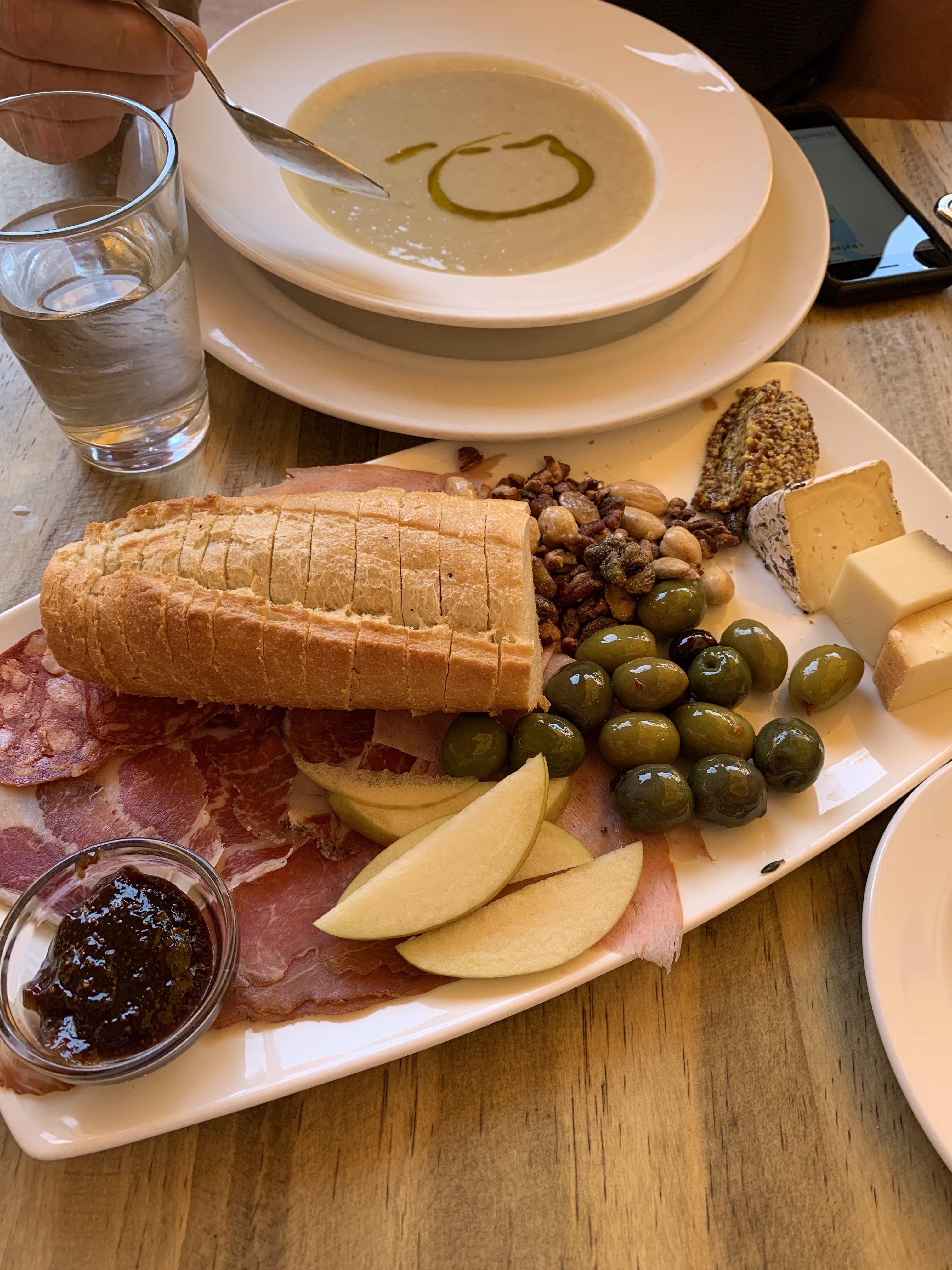 We had a nice table on their outdoor patio. The waitress began by bringing us wonderful warm bread to snack on while we waited for our lunch. I ordered a blood orange quencher (non alcoholic) which was quite refreshing, and had hoped to get the cheese tower, because I had heard good things about it. But it wasn’t currently available on their menu. Knowing we had more lunches on the horizon, I simply moved on to the Cheese & Charcuterie. The fig jam was so delicious. I was dipping everything into it. I wasn’t crazy about the nuts because they had some kind of a sweet coating on them, But everything else was spot on. Mark ordered a glass of Sauvingon Blanc and the ham and potato soup. He raised an eyebrown though because he didn’t realize the soup was pureed, which is not his style.
