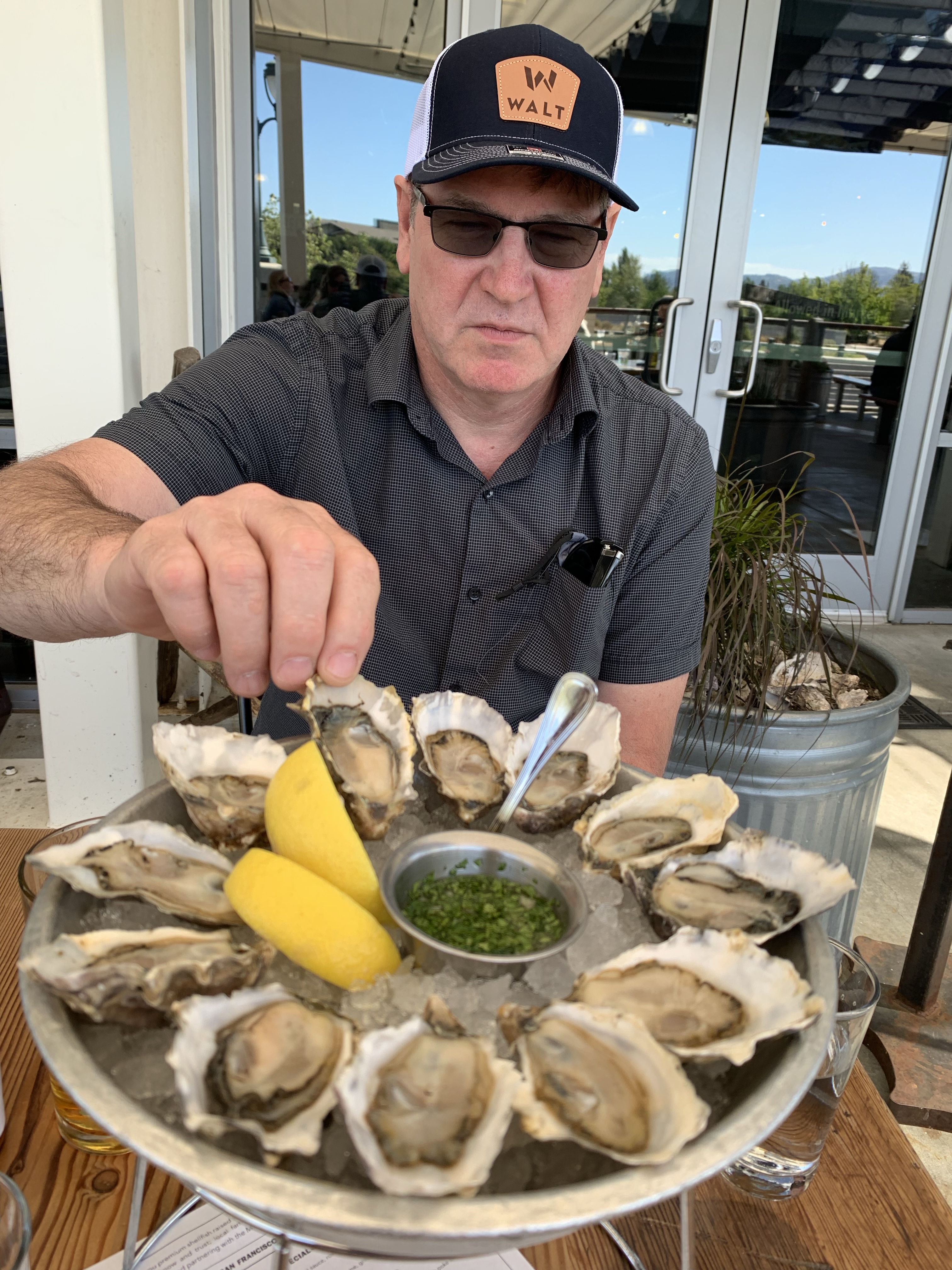 Our 2nd lunch was Hog Island Oysters at the Oxbow Market in Napa. Mark is a huge fan of oysters and I really wanted to take him there so that he could have some fresh local ones. Something that’s hard to do where we live in Michigan. When we got to the Oxbow Market, we walked around for a few minutes looking at all the different shops. About 3:45 we headed to their counter to order. Surprise, due to Covid and the labor shortage, they were currently closing at 4pm. Whaaaat? 4pm? I told the Hostess my sad story that we had no idea and that this was our one shot at eating there. She did end up seating us. In appreciation, we put in a quick and simple order for just a dozen oysters. They came with lemon wedges, cocktail sauce, horseradish, a wonderful mignonette and a baguette. They were fantastic! So glad we didn’t miss out!