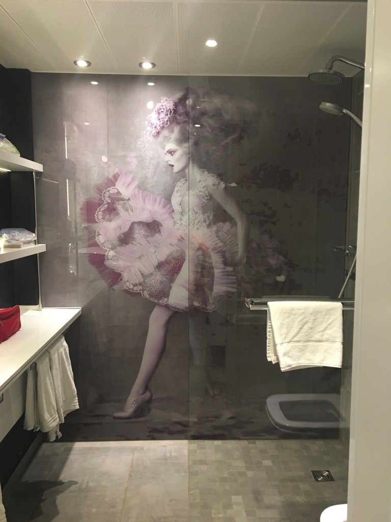 This was one of my favorite bathrooms from our last trip to Europe. The Renaissance Wien Hotel in Vienna was modern and artsy. All the bathroom features were spot on but boy we were surprised to find this lady in our shower! So fun.