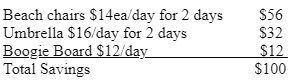 We took advantage of all of the bold items on the list. Here are the items we saved money on by not having to rent from one of the beach stands.