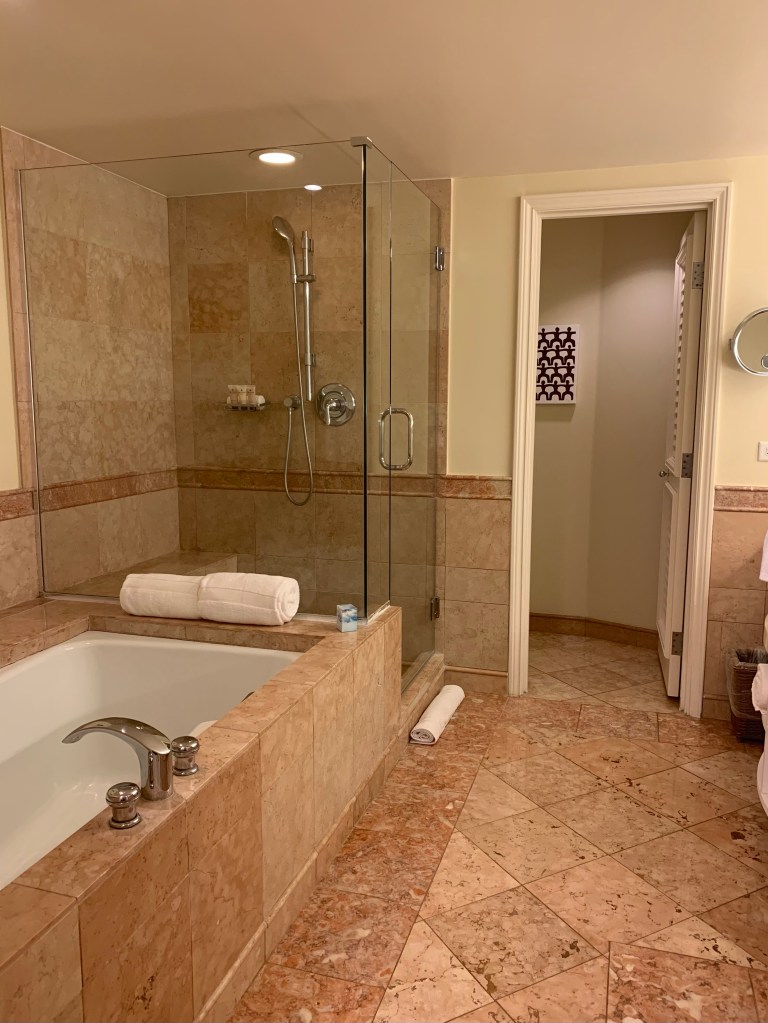 There were plenty of fluffy towels and vanity space for the two of us. The hotel also provided an adequate supply of honey mango Waldorf Astoria Spa bath amenities. If you wanted to use the deep soaker tub, there were extra towels and a box of Bath Bliss Lemongrass and Green Tea bath salts.