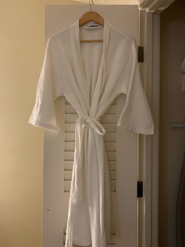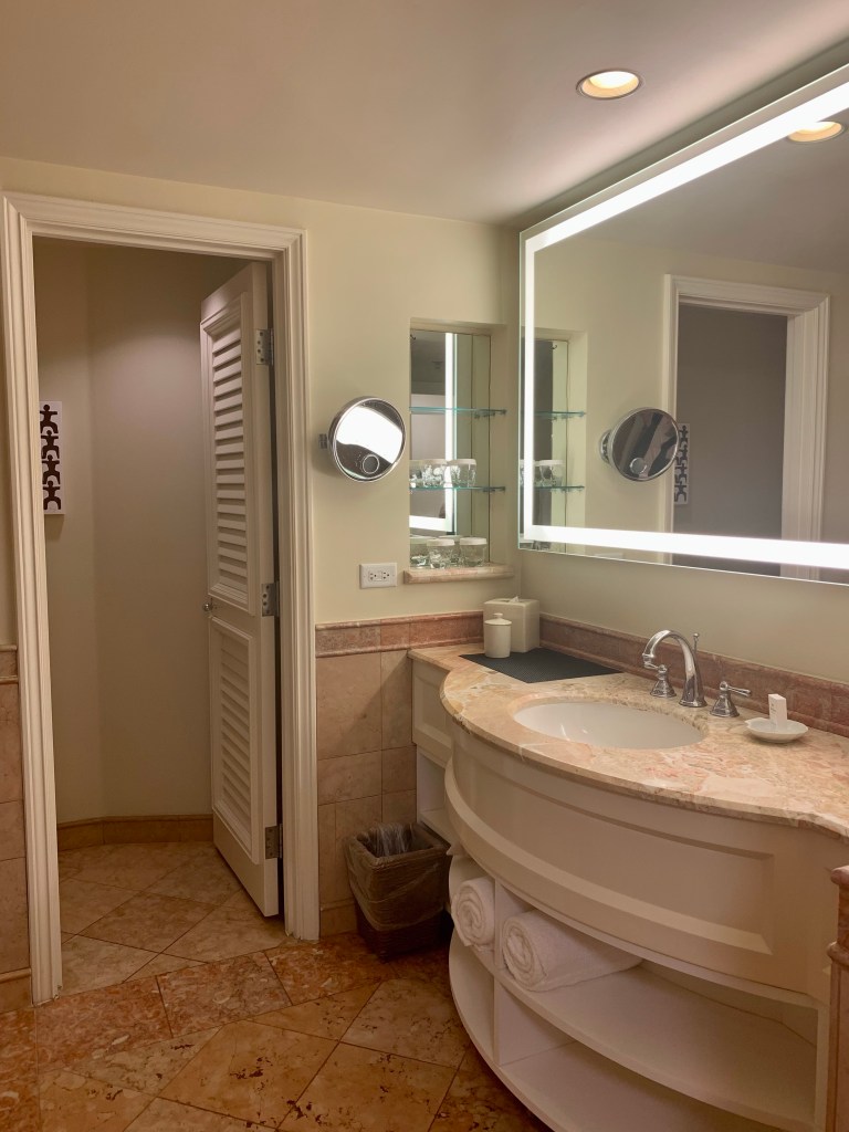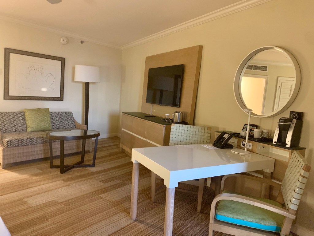 I always get a good night’s sleep when I stay at a Hilton because they have the best beds. They are so comfortable and there are always plenty of fluffy pillows. The room included a large closet with a small safe, a pair of comfy waffle weave robes, a luggage jack, and an ironing board with an iron. The room was spacious and furnished with simple “beachy” items including a small sofa, a table, and a pair of chairs. The dresser had enough drawers for both of us and also housed a mini fridge. It wasn’t fancy like one might expect from a Waldorf Astoria property, but it was comfortable and we had everything we needed.