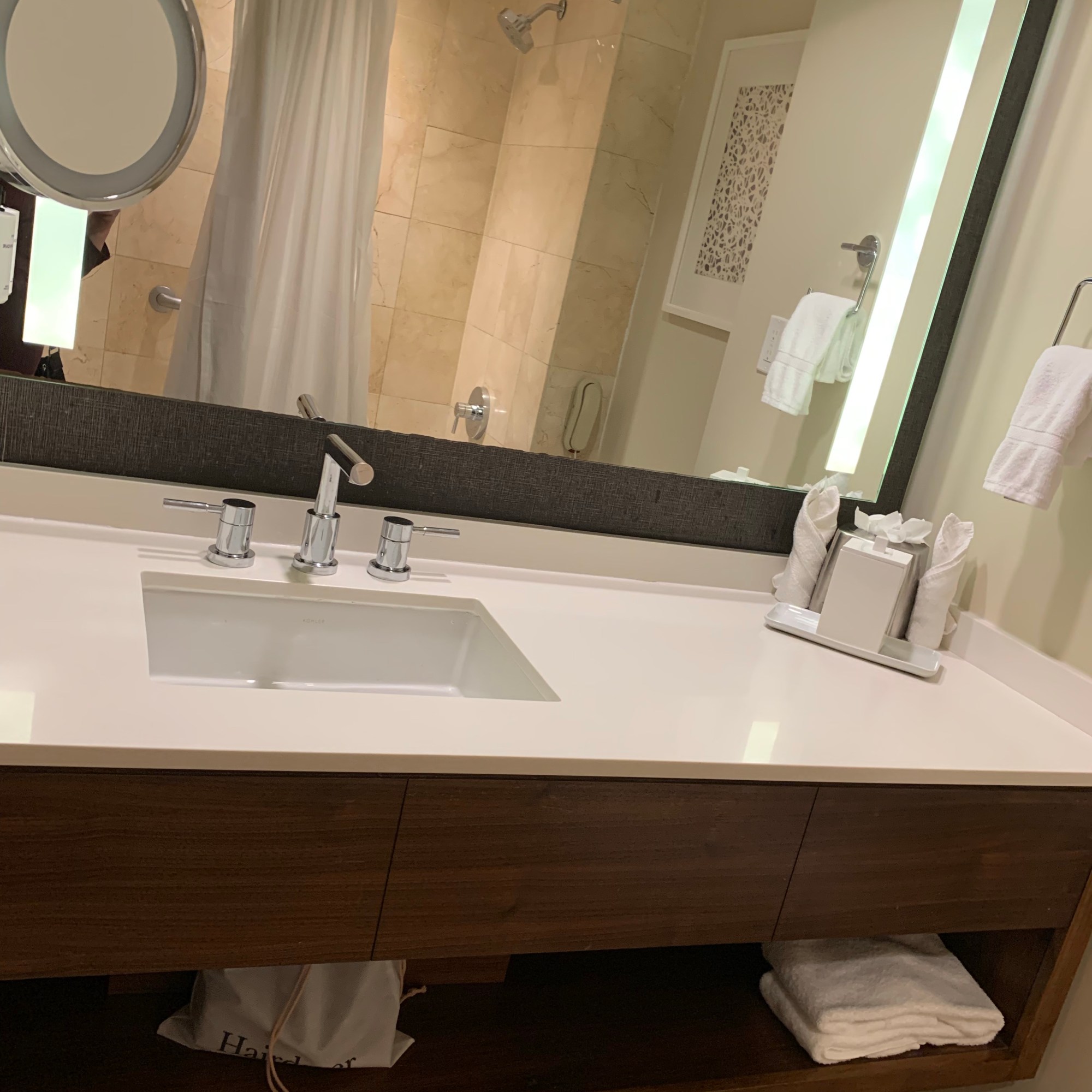 The bathroom was clean and well stocked with a vanity that had more than enough space for the 2 of us to spread out our toiletries. The lighting was pretty good and there were plenty of thick fluffy towels. Like many hotels, IHG is trying to be more sustainable by moving to refillable bath amenities. Although I am not a huge fan (I always imagine that they have been tampered with), my husband had no objection to using them. I simply used products that I brought from home.