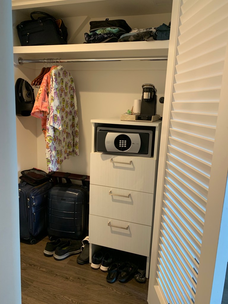 I am the type of traveler that unpacks immediately when I arrive in a room. The closet had 3 small drawers, a safe, a luggage jack, and an iron. Oddly, the coffee maker was also located in the closet. Since there was no plug in the closet we had to carry it out to the tv stand in order to use it.