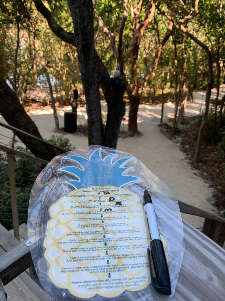 As we were walking around the resort, we spotted some pineapple statues attached to wooden boxes with a letter of the alphabet on them. After seeing a few of these, I inquired at the front desk as to what they were. They are part of a Pineapple Scavenger Hunt on the property. There is a prize if you correctly complete the challenge. You can pick up a dry-erase marker and the clue list from the beachfront towel cabana. We gave it a shot one day and I was able to solve the clues and find all but one of the pineapples. It was still fun.