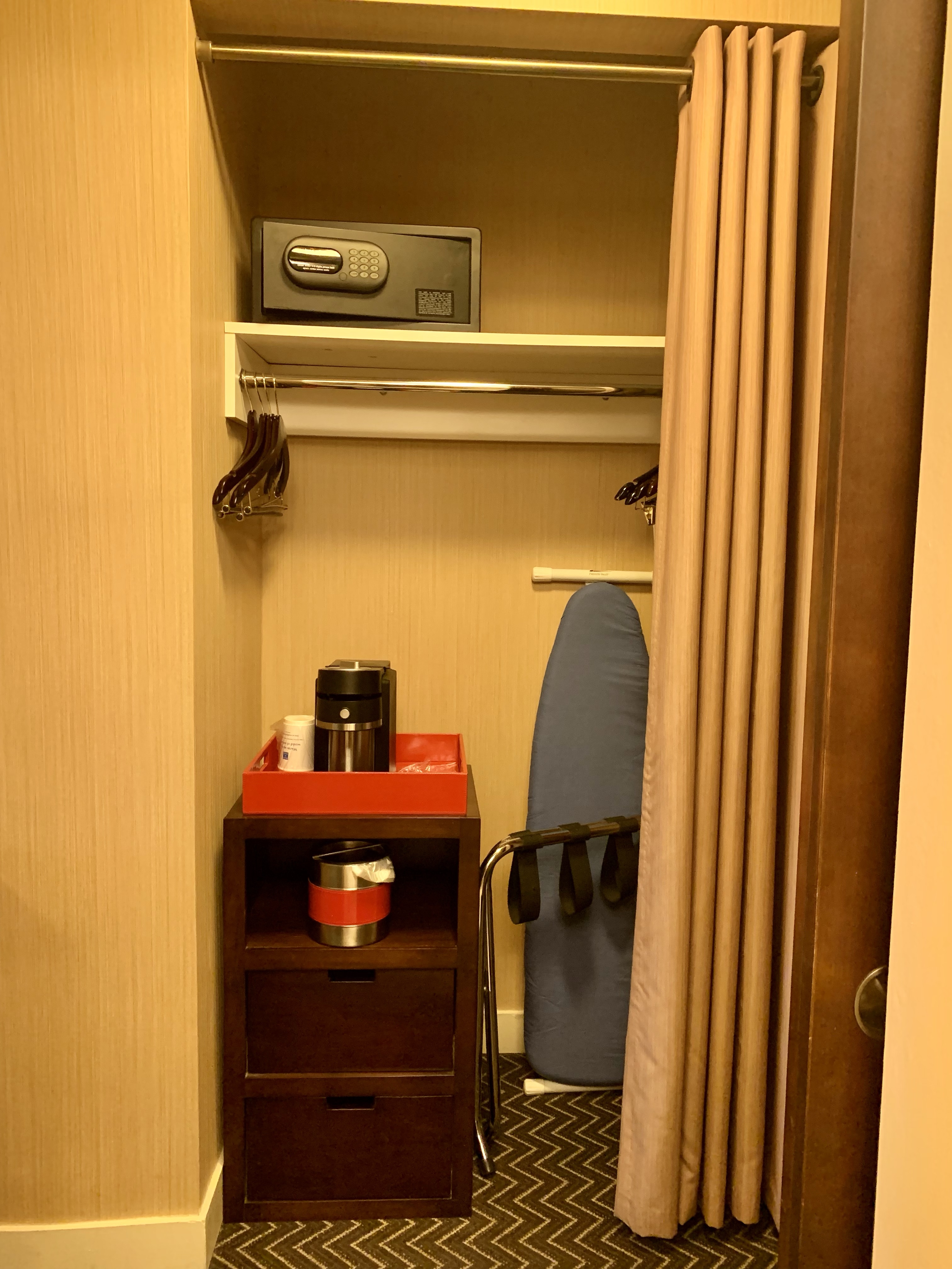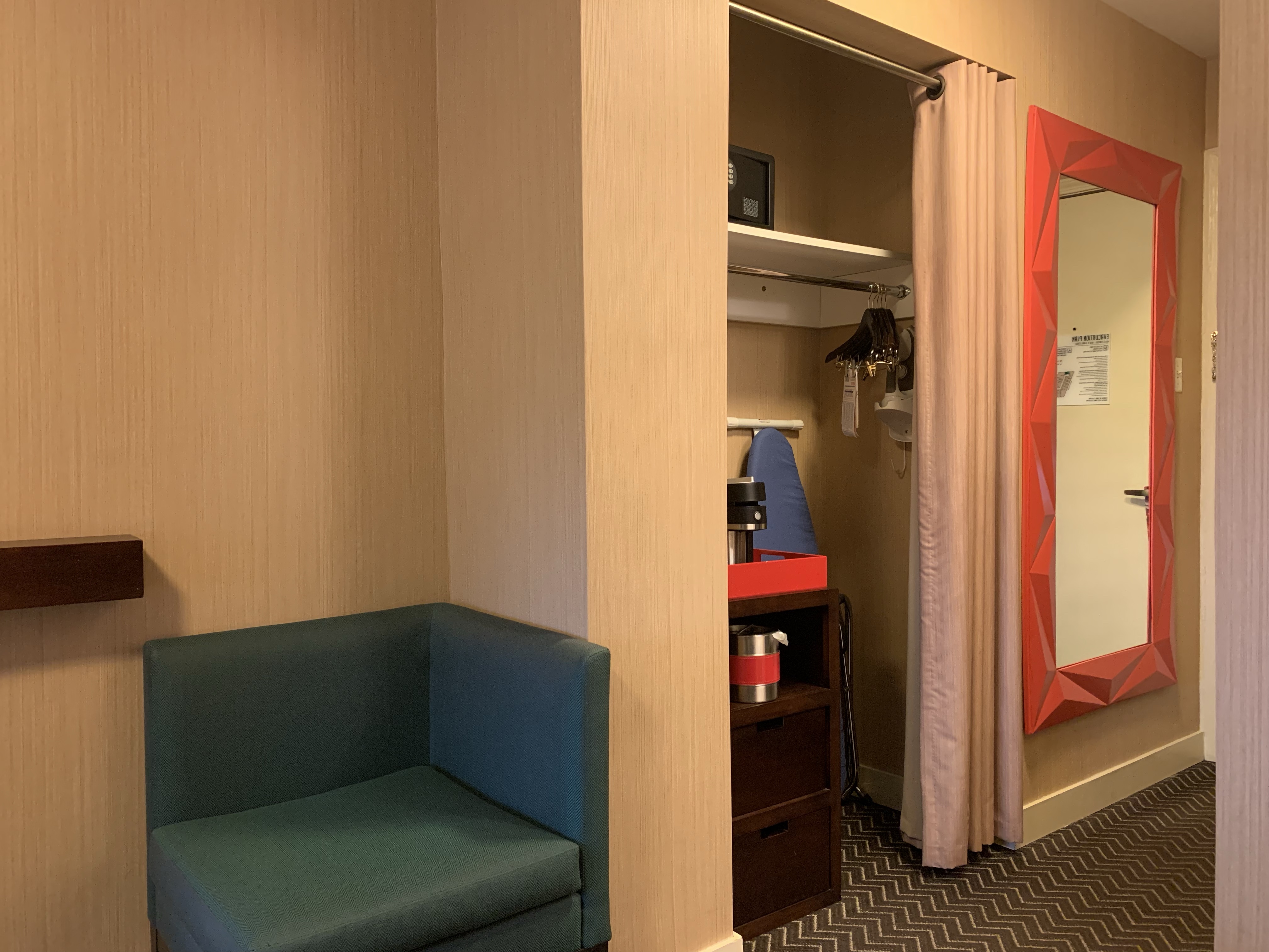 Now that you know a little bit about the hotel, let’s talk about our room. The room’s style reflects the hotel’s vibe with retro fixtures and furniture. There is a large full-length mirror when you enter the room which is great because the bathroom is very small. Next is the closet with two storage drawers, an ice bucket, a coffee station, ironing equipment, a luggage jack, and a safe.