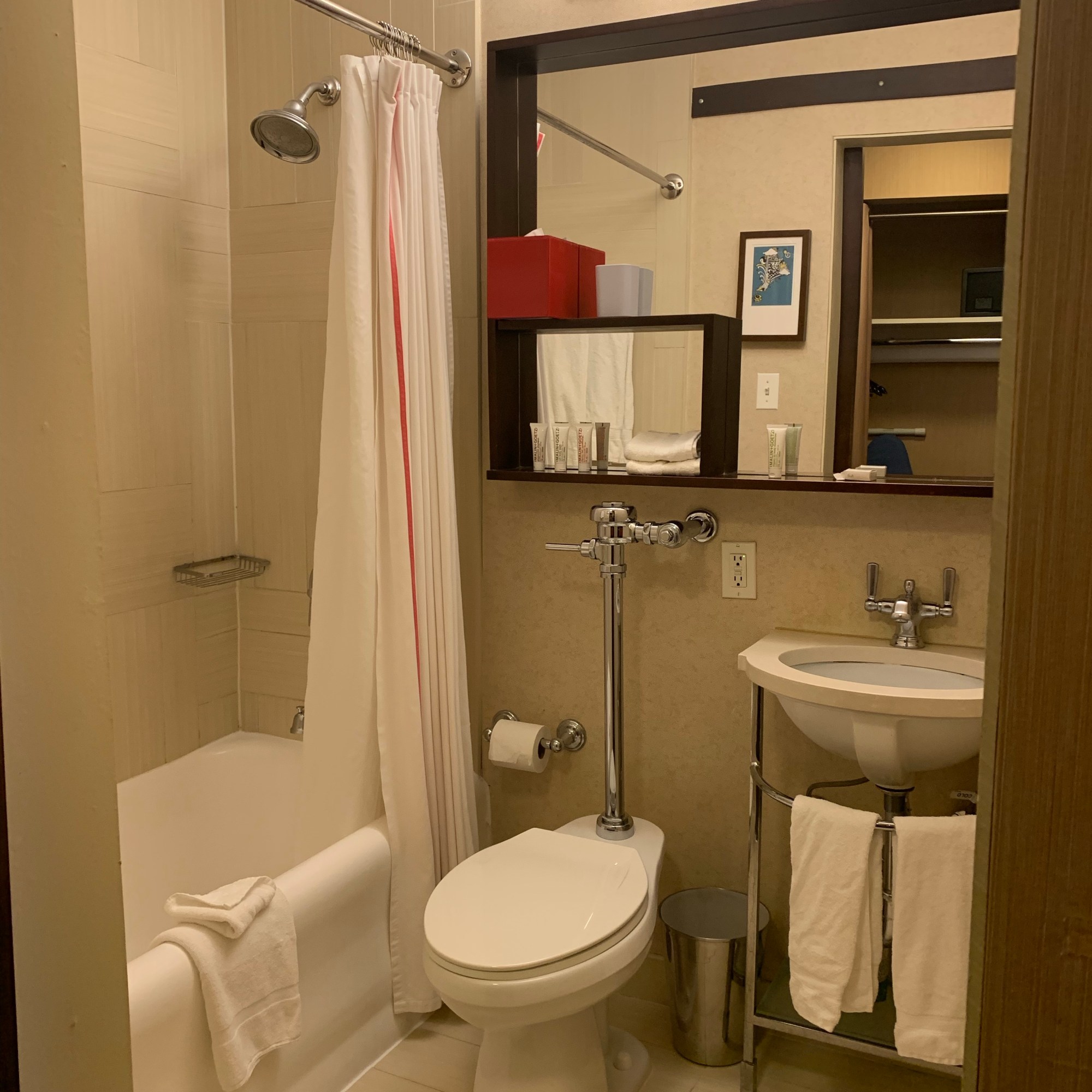 The bathroom is located across from the closet near the entrance to the room. Still demonstrating the hotel’s retro style this bathroom has everything that you need during your stay….except maybe space. They have tried to solve that by adding some extra shelving around the bathroom mirror to give guests a place to put their toiletries.
