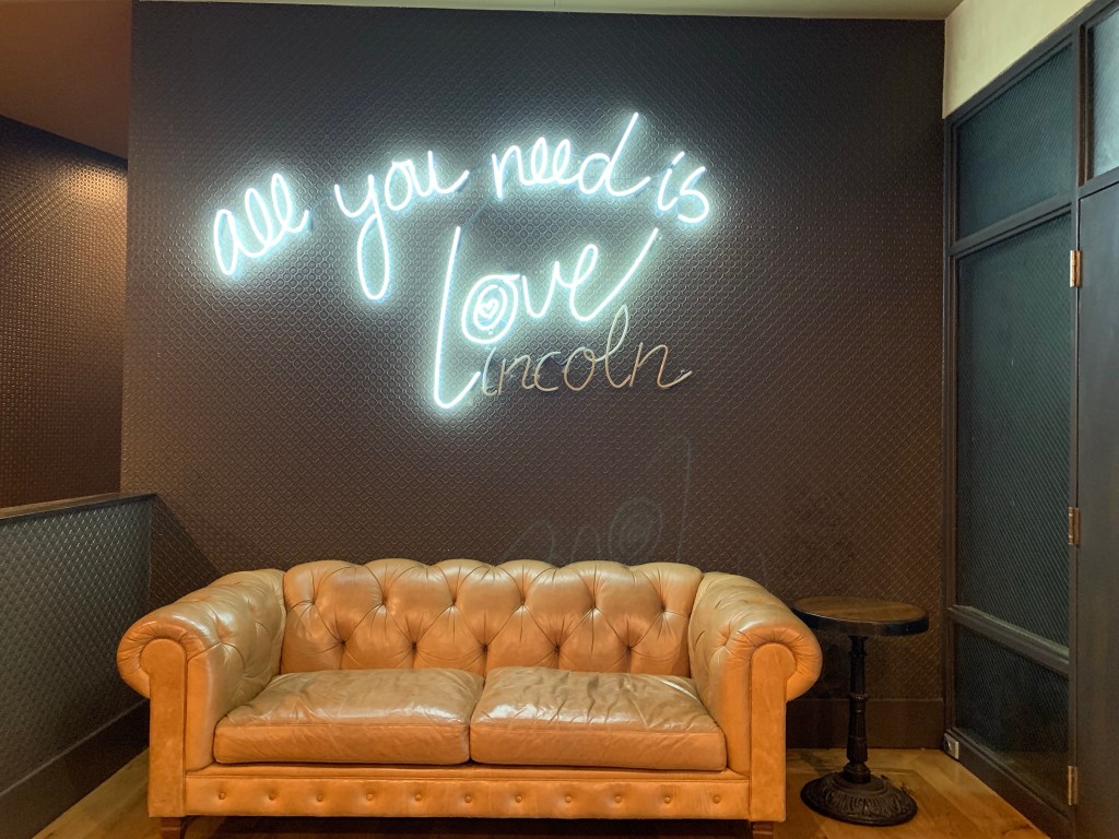 The Leather Sofa with a Flashing Neon Message in the Lobby is the Perfect Instagram Spot!