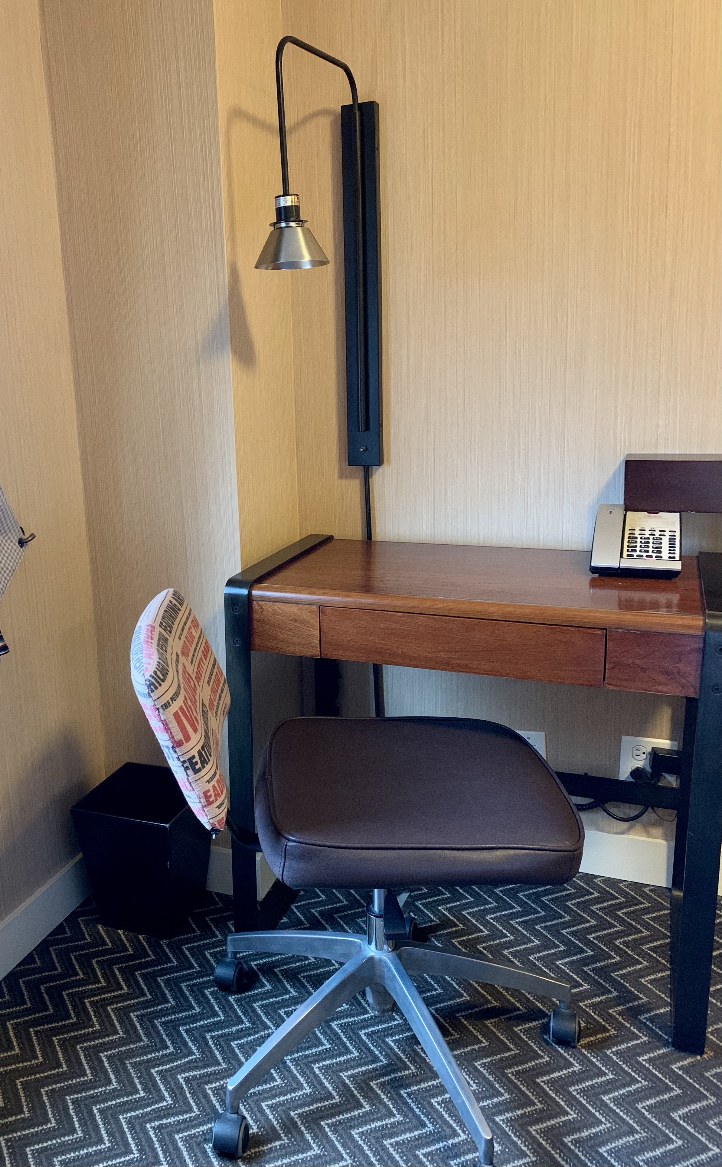 As you enter the main room, there is a cute little corner chair and a compact workstation with an overhead lamp and rolling chair. They have carefully thought out all of these details to meet guest needs and still fit into the room’s small footprint.