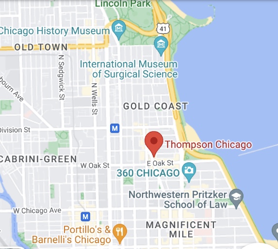 The Thompson is located at 21 E. Bellevue Place in Chicago’s luxurious Gold Coast neighborhood. The hotel is walkable to many shops, restaurants, and transit options.