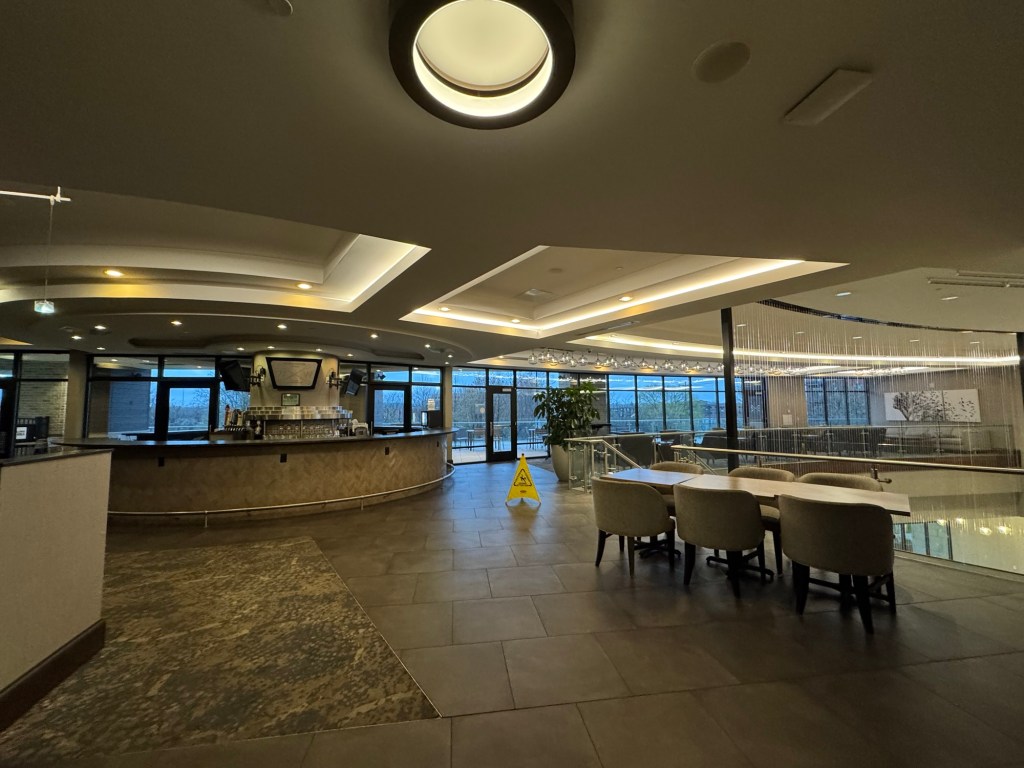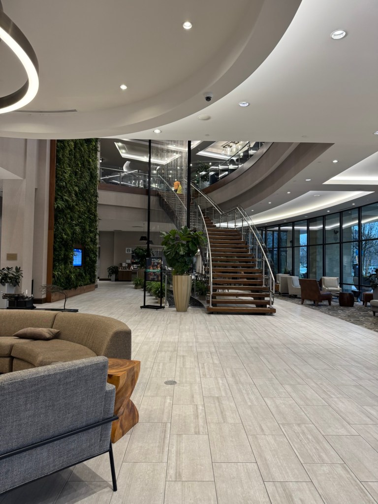 The Lobby is huge and features a central staircase with a waterfall feature. You can find a digital flight schedule display for the GRR airport located on the wall near the staircase. A handy feature if you are traveling by air!