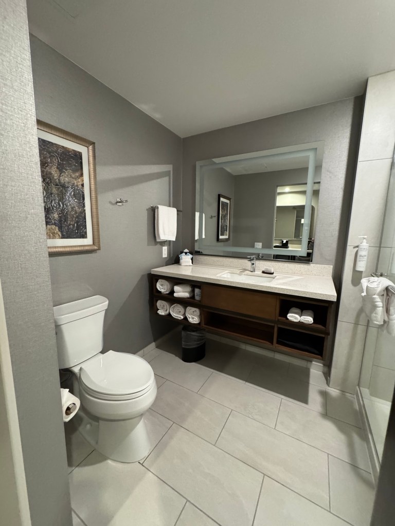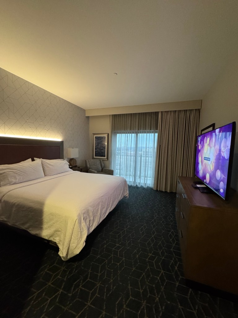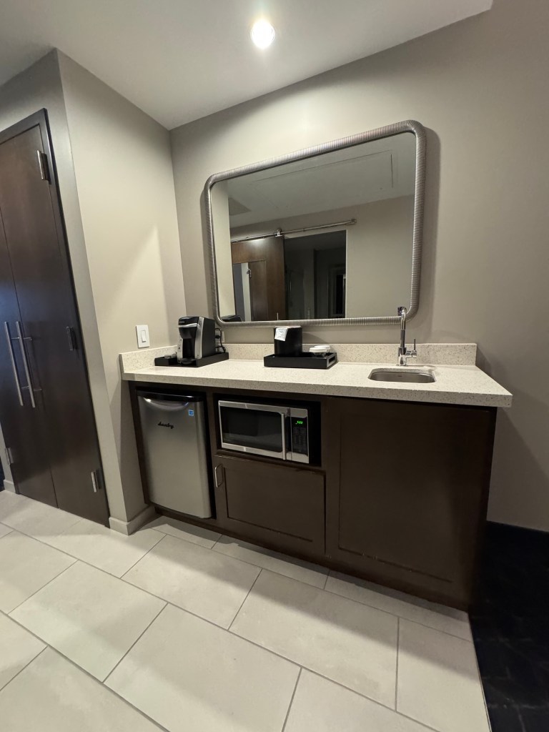 Our King Studio Suite was nice and very spacious. Because we spent more time than usual in our room, we really appreciated the extra space. The living room area was equipped with a 55″ flat screen TV and a desk with a chair for people who need to work during their stay. The sofa was a sleeper, so it could have easily been pulled out if we were traveling with kids or an extra guest. The kitchenette included a fridge, microwave, a bar sink, and a Keurig coffee maker.