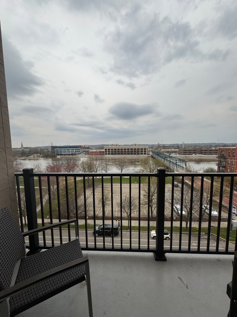 Since it was a dreary weekend, the evening view from our 5th-floor balcony was much better than the day view. The lights reflecting on the river were pretty.