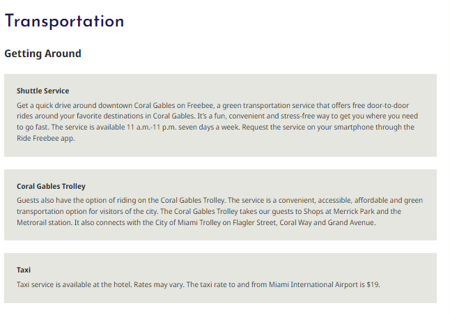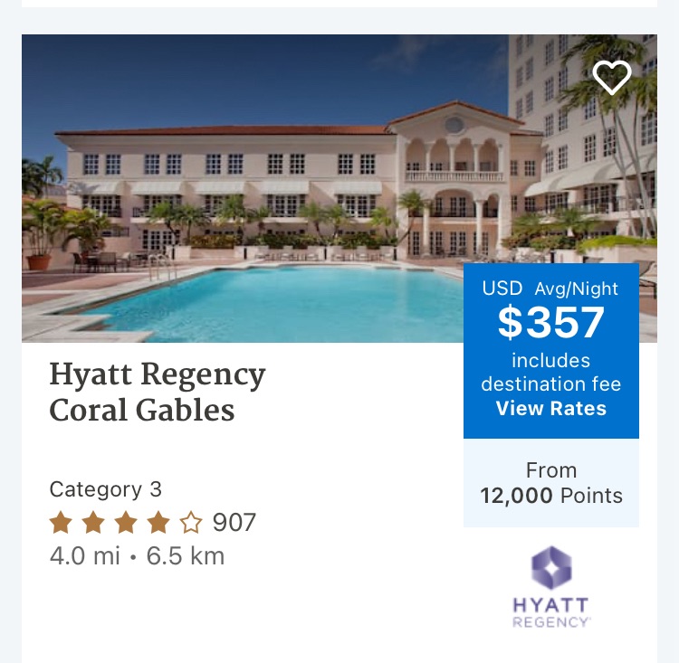 I was proud of my planning for this trip because I had booked all of the flights and hotel nights with points, miles, or Free Night Certificates. So when I began researching a hotel, I also checked to see what tools I had available. We had a Hyatt Category 1-4 Free Night Certificate that needed to be used soon, so I focused my search on Hyatt hotels. The Hyatt Regency Coral Gables fit the bill perfectly and would also give us our 4th Hyatt property type for their Brand Explorer program. One more and we will earn another Free Night Certificate!