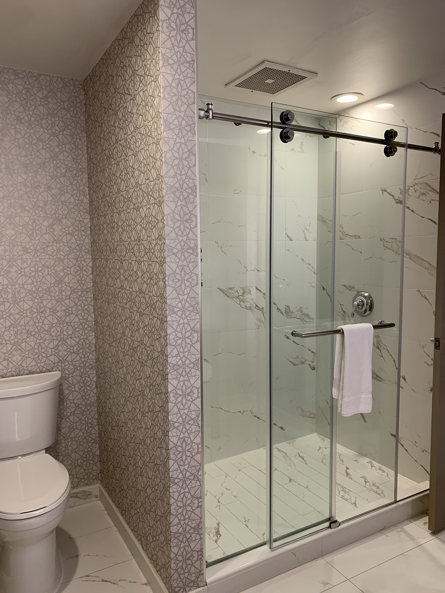 One of my favorite hotel bathroom features is an adjustable sliding showerhead. My husband is 6’1″ and I am 5′ so there is a lot of difference in how we prefer our shower settings. This one slid up and down on a track and could also be used as a handheld.