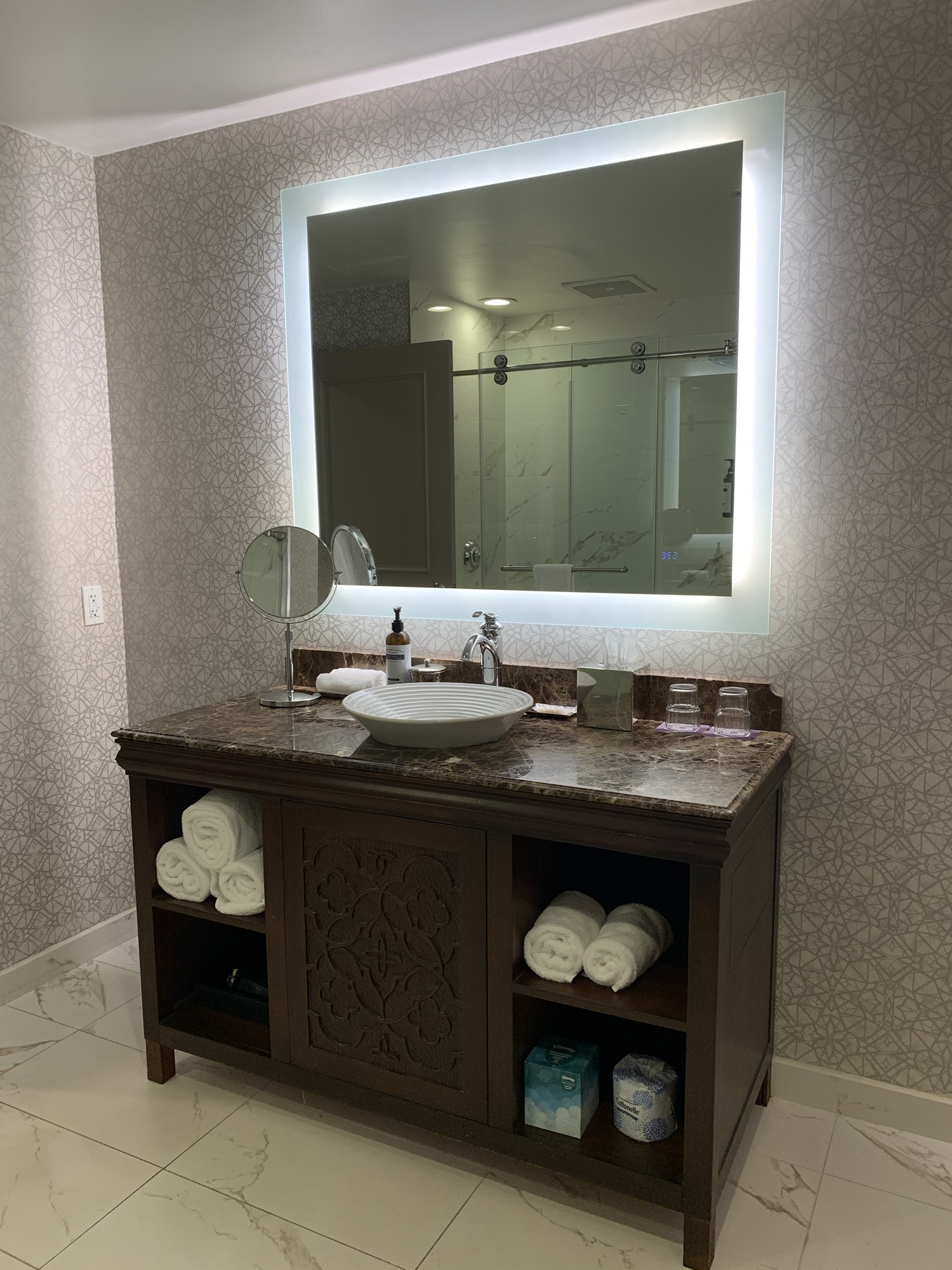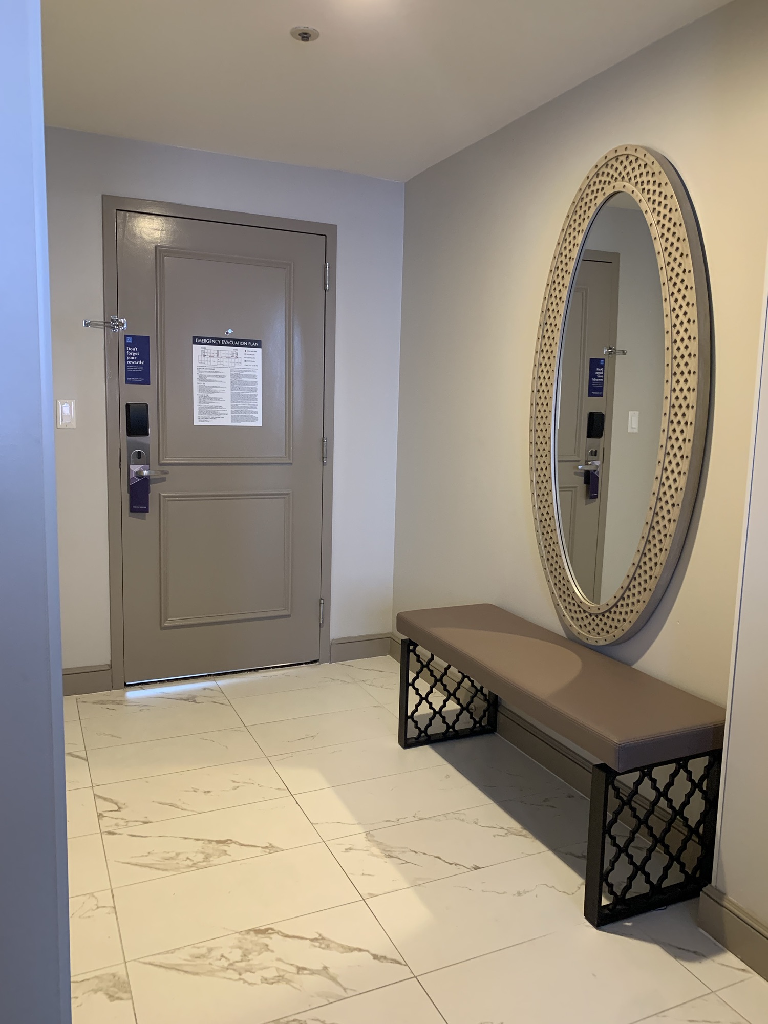 In addition to our super comfy King bed, we also had a pullout sofa. We didn’t need one for this trip but it’s a great feature when you do. The coffee station and mini fridge were located in a separate area outside of the bathroom. This area also contained a double closet with full mirrored doors. There was an additional mirror and seating area in the entryway which was the perfect place for putting on shoes and doing a final check on your way out the door.